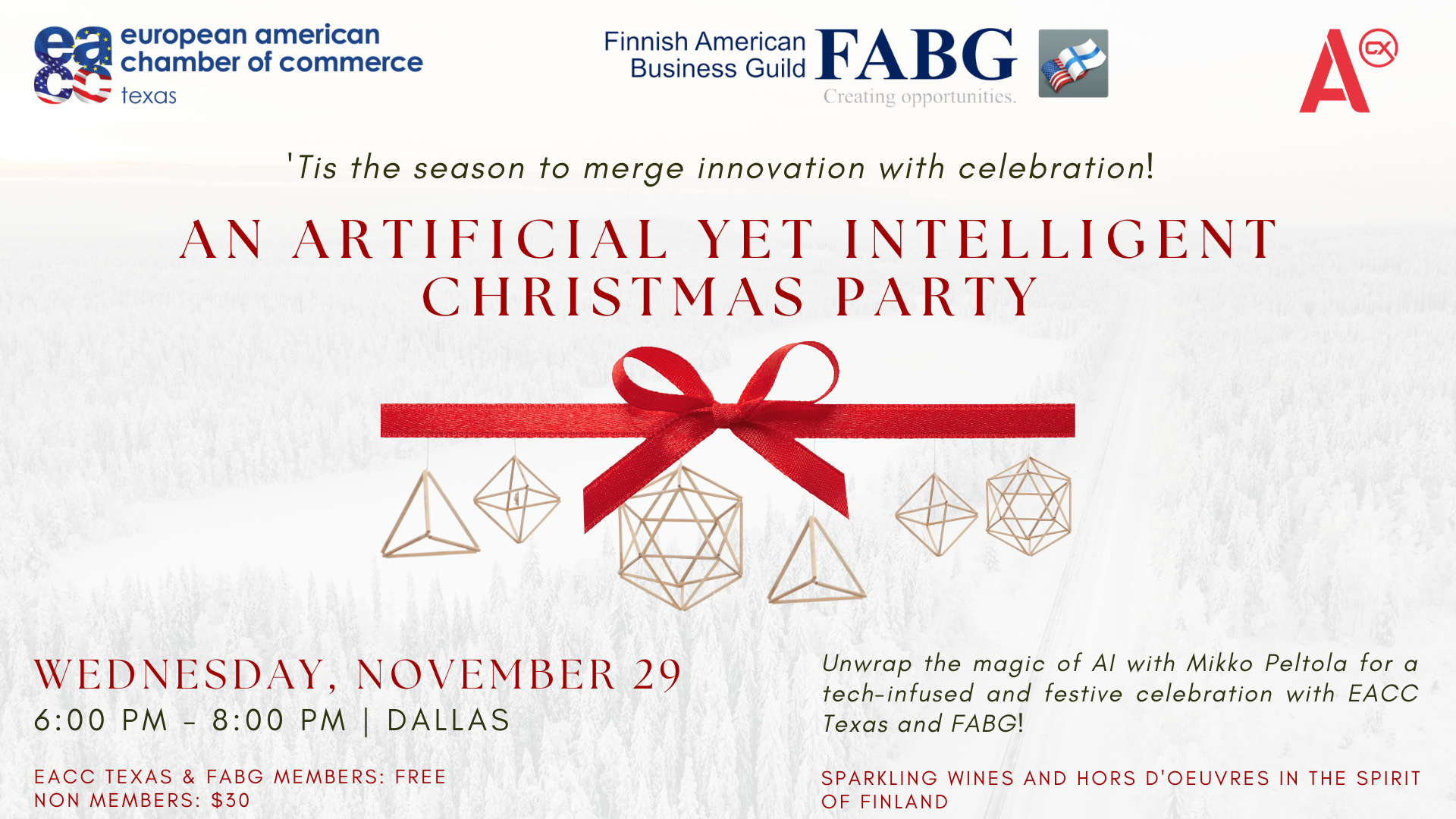 7:00 PM – European Christmas Celebration Mixer with Sparkling Wines, Long Finnish Drink and hors d’oeuvres in the spirit of Finland