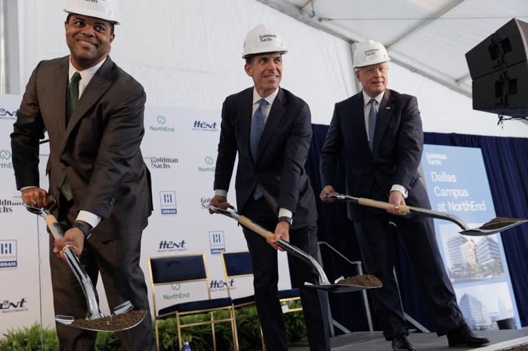 From left, Dallas Mayor Eric Johnson, Goldman Sachs President John Waldron and Ross Perot Jr. last year at the site of Goldman’s project. PHOTO: SHELBY TAUBER / BLOOMBERG NEWS